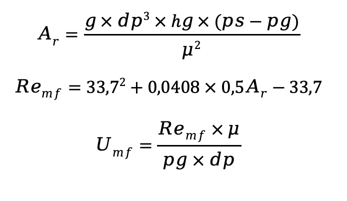 Для оцінки необхідної витрати повітря використовується мінімальна швидкість флюїдизації Umf. В інженерній практиці для попередніх розрахунків застосовується кореляція Wen & Yu: