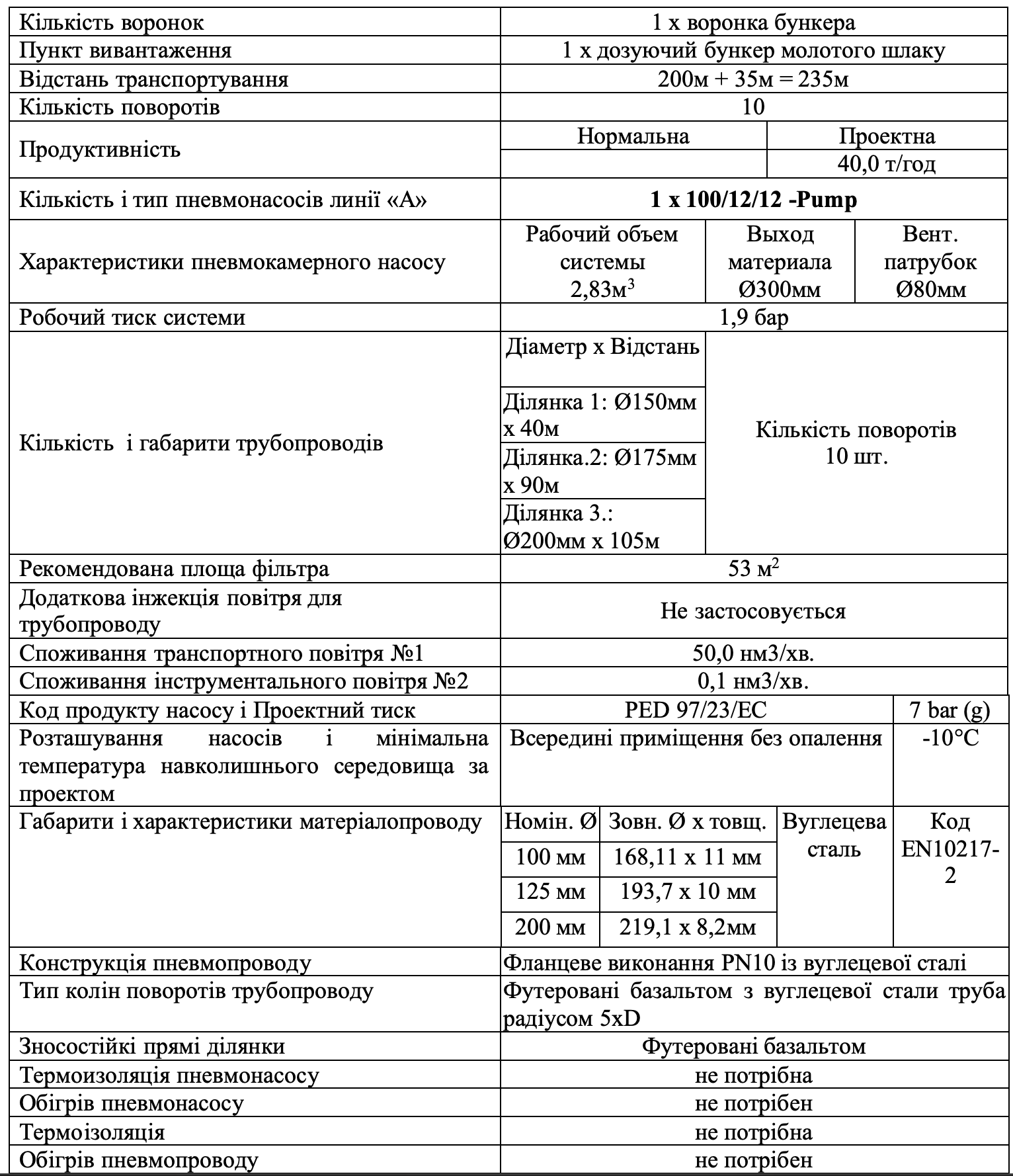 У таблиці нижче представлені вимоги до повітря, що використовується для транспортування, контролю, псевдозрідження, аерації та очищення фільтрів для пневмотранспортних систем «А» і «В».