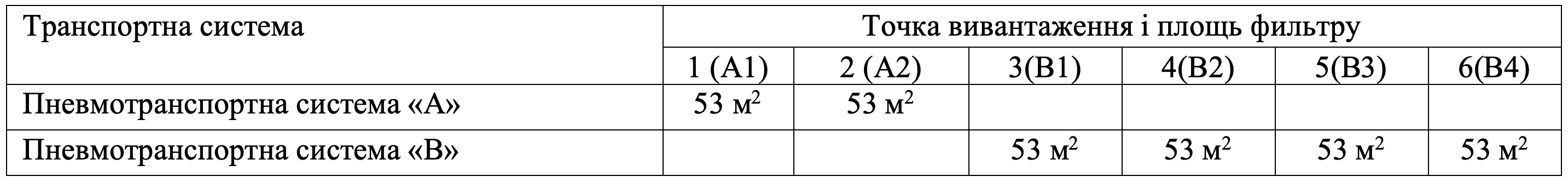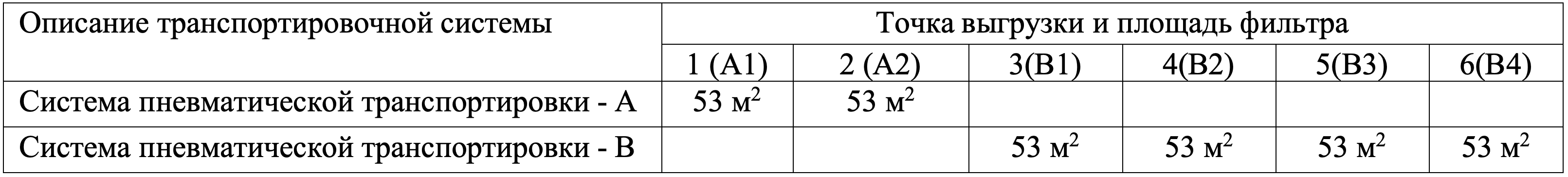 Для пневмотранспортних систем «А» і «В» розмір фільтра для кожного з приймальних силосів визначений на основі повітряного потоку зі швидкістю фільтрації від 0,8 до 1,5 м/хв. через звичайний рукавний фільтр.