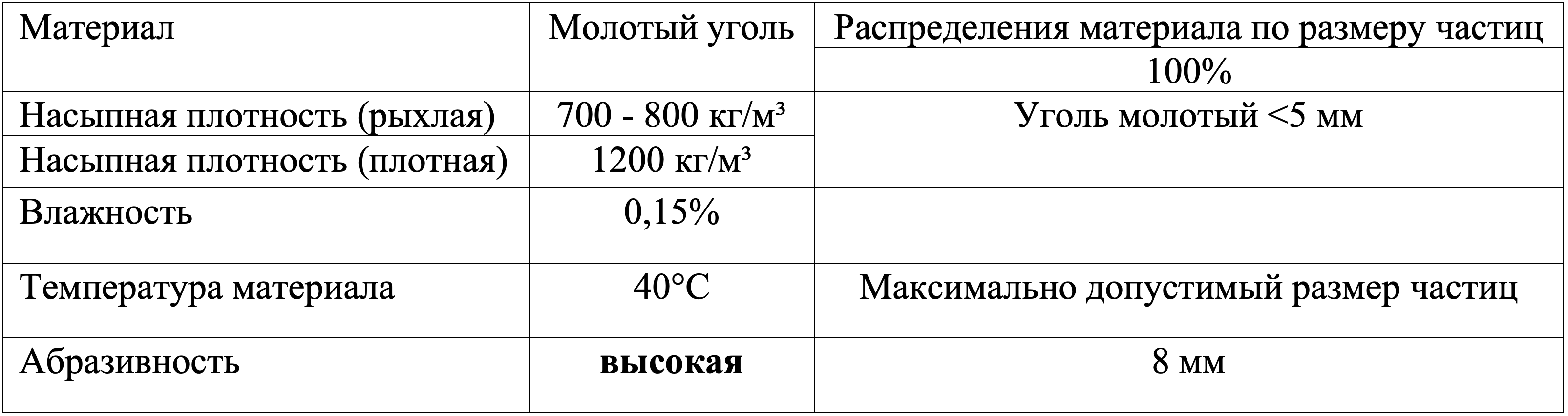 Материал (молотый уголь) транспортируется по трубопроводу Ø150мм с переходом на Ø175мм, а затем на Ø200мм для уменьшения скорости транспортировки материала и снижения абразивного износа элементов материалопровода.