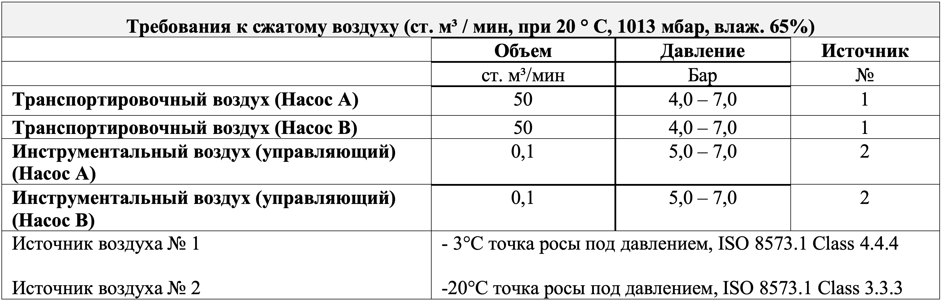 В таблице ниже представлены требования к воздуху используемому для транспортировки, контролю, псевдо-ожижению, аэрации и очистке фильтров для пневмотранспортных систем «А» и «В».